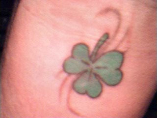 Okay, this isn't the last tattoo, but the others are on my back and a little more difficult for me to take pictures of. This one is done on the inside of my left wrist, right where the palm of my hand ends. Most people that would get a clover tattooed on them would get a 4-leaf clover. Well, 3 is my lucky number, so I downsized