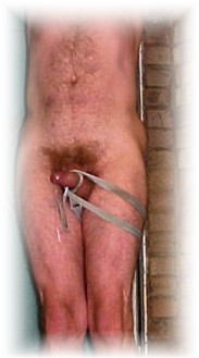 The belt of the coat loosened as she spoke and the coat fell open, the black gaping wide enough to expose a full cleavage of ivory coloured breasts and an inverted triangle of dark pubic curls. Father Glyndwr's eyes were drawn to her, they devoured her body, flashing up her legs and over her stomach passing her chest to her throat then back down. As he looked he felt his cock stiffening, he tried to take his mind off her but she captivated him, drawing him deeper into her web of desire. She came forward to him and ran the whip over his stiffening member, raking a solitary nail along the underside of his swollen shaft making twitch and jump. The priests eyes closed as she took a firm hold around the base of his now full erection. Suddenly he felt a constriction, she was refitting the harness that she had used to pull him from the church and she was tightening it…