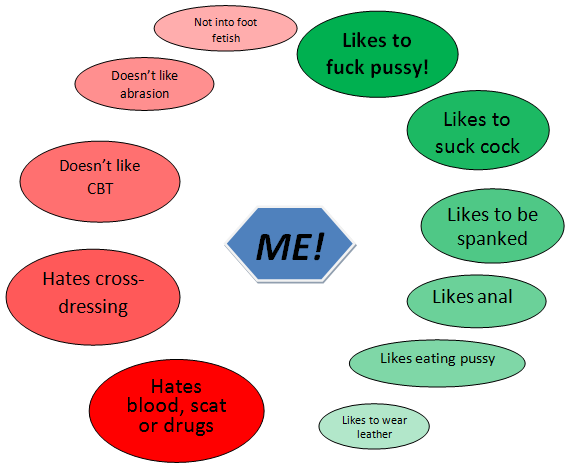 It's not necessarily true for me, but it's close enough. The stronger the red, and larger the circle, the more I dislike or am not turned on by that act. On the other hand, the stronger the green and larger the green the more that floats my boat.