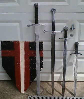 PF, the second from the left. Going from left to right: 1 meter broadsword from Starfire Swords, Anduril from Darksword-Armory, a 32" that I picked up from the local Renaissance Fair, and a single hand broad sword from Stage Steel. The last I modified the handle on to give it a tighter grip and make it handle heavy.