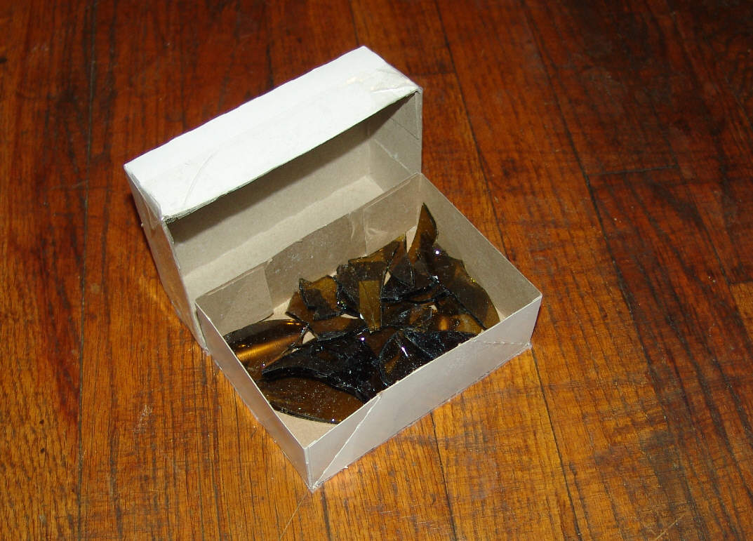 Now wrap a wine bottle up in a large plastic bag that give it at least a 4 layer thick covering. With a small tack hammer, 'disassemble' the bottle.  Put these peaces in a small box that will be wrapped and taped on all sides and marked "DO NOT OPEN".