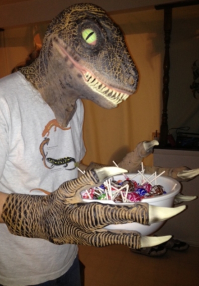 Sad _Deinonychus_ is sad, because this evening's rain drove away the trick-or-treaters, and he was stuck with a bowl full of candy instead of being able to eat trick-or-treaters.