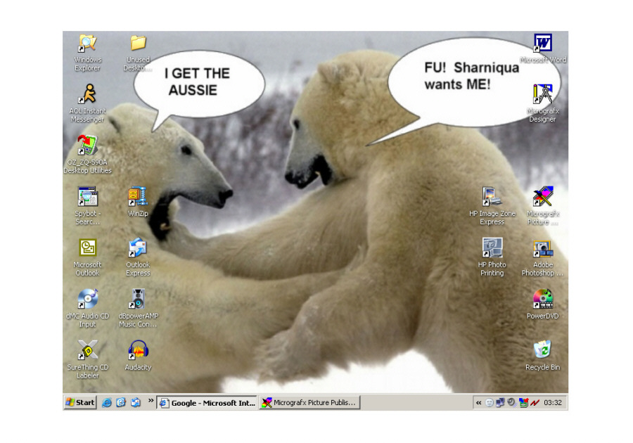 You will all be able to tell that I have children when I say that my desktop theme is Veggie Tales. Larry, Bob, Mr. Lunt, Mr. Nezzer and the rest of the vegetable gang are on my wallpaper, my sounds, my icon and my screen saver. My kids laughs and giggles when the computer does something makes it all worth while.