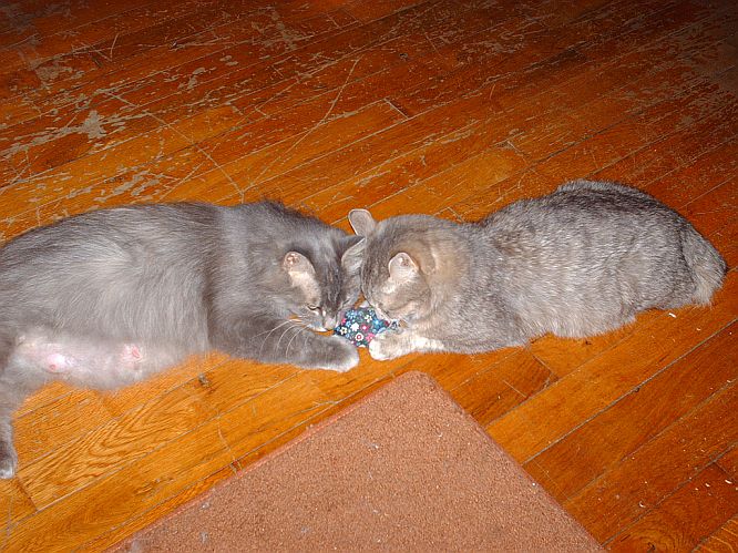 The last pic of this group is of Fluffy & Gabby taking a bit of time off to relax with a catnip toy. Yep, these kittens have driven them to the hard stuff.