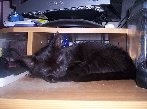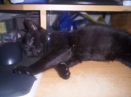 She likes to sleep on my puter desk while i'm here