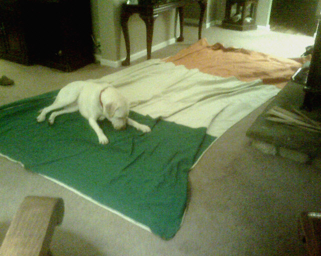 I was just able to make my way to a nearby shopping center with a fabric store before their late closing  and the elderly ladies were thrilled to see me stagger in.  When I told them I just wanted material for an Irish flag, they nodded with this numb look on their face. .......... It is beyond me why anybody would hire people that didn't have physic abilities to wait on customers.  I could see they needed help ............. "Just a stripe of green, white and orange material............. and the stuff that goes around the edge............ and some heavy stuff for the clip side."  After showing me the flimsy material not suited for making a flag, they brought out the good stuff and wanted to know how much 10 ounce cotton duct I wanted? .... "A stripe of each"  Now their 'yard' is not 36" but 42" wide.  I could see they needed more help.
